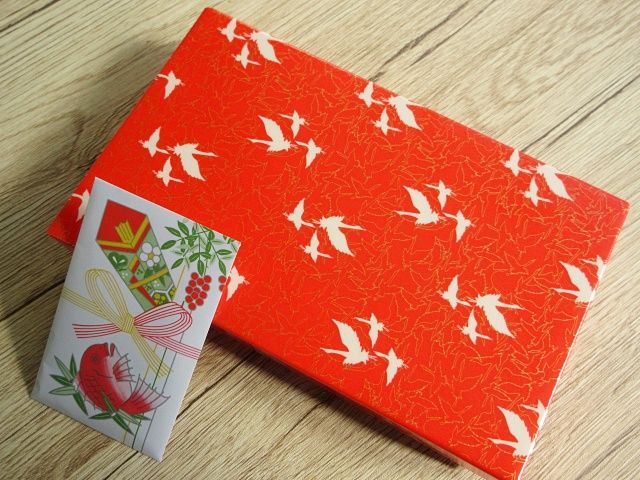 包装は、お祝い気分を高めてくれる縁起のよさそうなデザイン。包み紙を外すと、真っ赤な背景に飛び立つ鶴たちの絵柄。シンプルながらも和を感じさせる鮮やかなデザインです。そして、鯛がプリントされたポチ袋も発見!