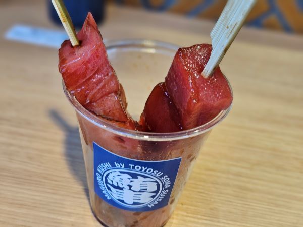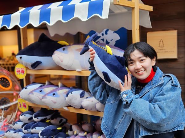 来場の記念になる「豊洲のマグロ」ぬいぐるみです。次回にくじ引きをするときには、大きいサイズのマグロぬいぐるみが当たるように頑張ります。