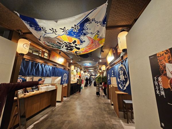 屋外の「豊洲目抜き大通り」に並行して、屋内に「目抜き横丁」の通りがあります。いずれも、飲食店や食材販売店、土産店が並びます。