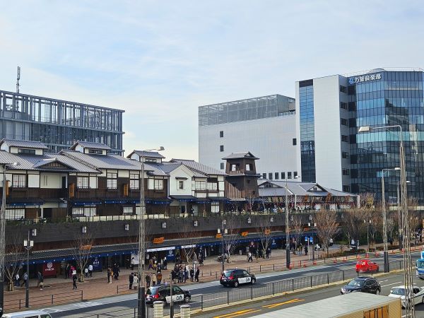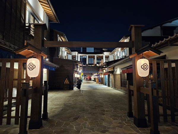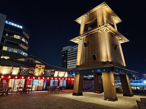 江戸の街並みを再現した商業施設、食楽棟「豊洲場外 江戸前市場」と、敷地内奥にある高層ビルの温浴棟「東京豊洲 万葉倶楽部」からなります。