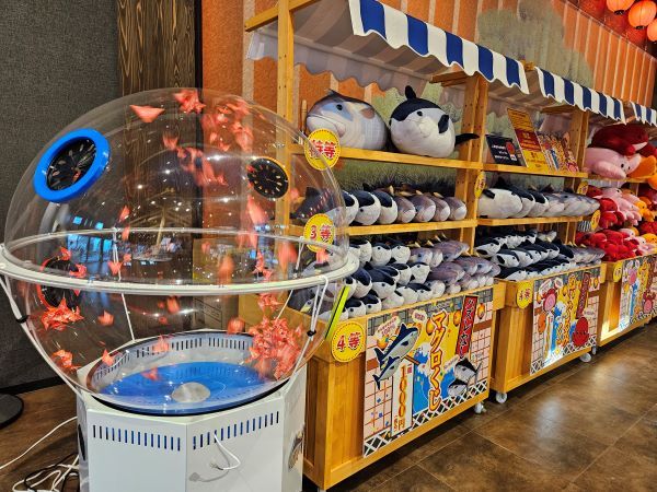 「豊洲目抜き大通り」沿いの土産店で、マグロのぬいぐるみが当たるハズレ無しのくじ引き(1,000円/1回)をしました。