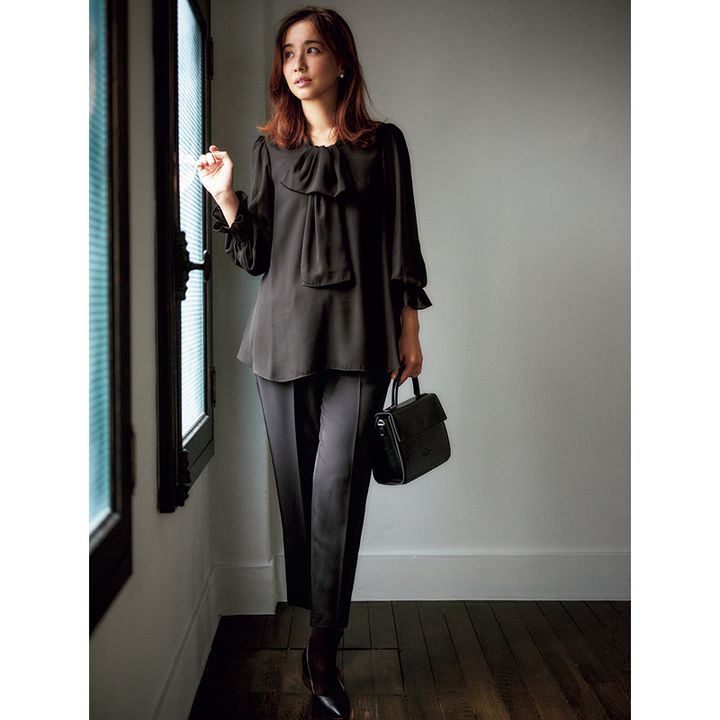 いつもの黒パンツに ボウタイブラウスで華やかさを。 ブラックフォーマルも地味すぎない