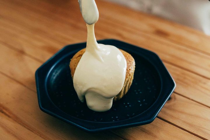 焼き上がったキャロットケーキに、フロスティングを乗せていきます。今回はカップ型から外して、上からかけるスタイルで。