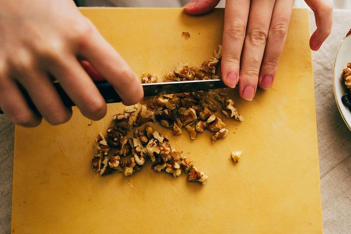 くるみは、粗く刻みます。大雑把にざくざく大きめにカットしちゃってください!と言いつつ、私はこのカットしている感触が好きで、ついつい細かくなりがち...まぁそれもよしということで、!