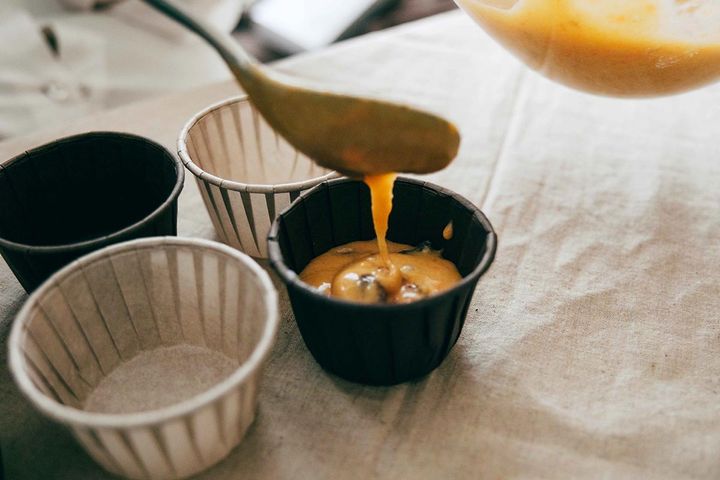 カップの8分目まで生地を入れていきます。とりあえず半分まで全てのカップに入れてから、残りの生地で微調整していくと、具の量もいい感じに配分されるのでおすすめ。180度で20分焼いていきます。