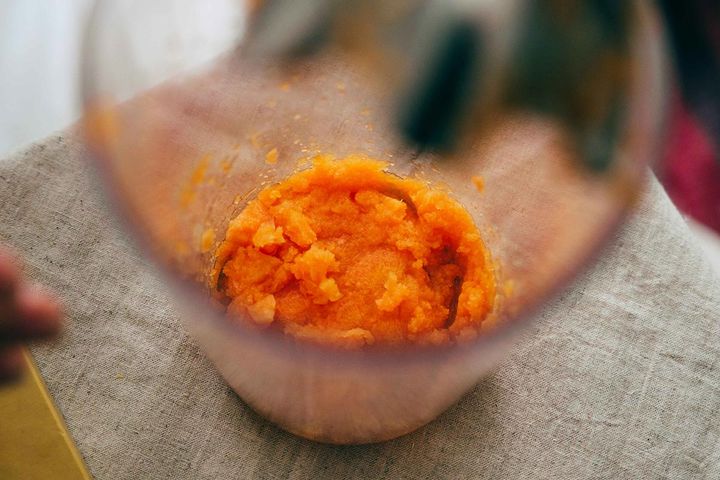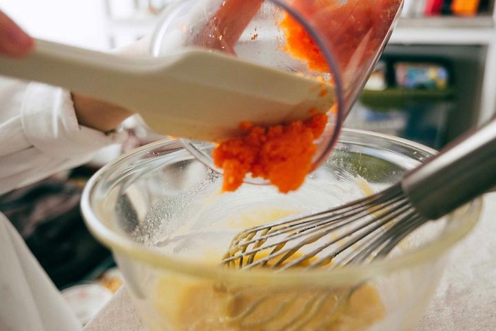 細かくしたにんじんをボウルに入れて、混ぜ合わせます。生地全体がふわーーっとピンク色になっていくのも綺麗。ゆっくり混ぜて変化を楽しんでみてくださいね。