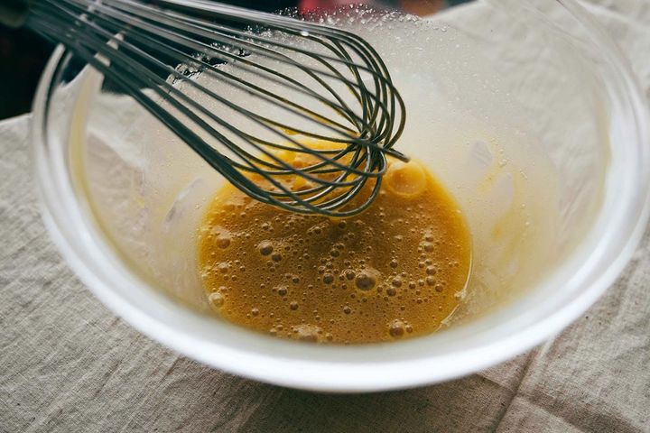 卵を解きほぐして、きび砂糖を入れて泡立て器で混ぜます。砂糖の固まりがなくなるように、思いっきり混ぜていきましょう〜!
