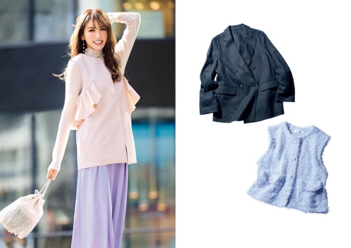 服を見る目を鍛えられたからこそ、ミーハーなアイテムだって、自分らしく取り入れられる!ロングジレは透け感ニットを仕込んで奥行き感を演出。きれい色ボトムスはスカートではなくあえてパンツを選んで甘さを引き算して。