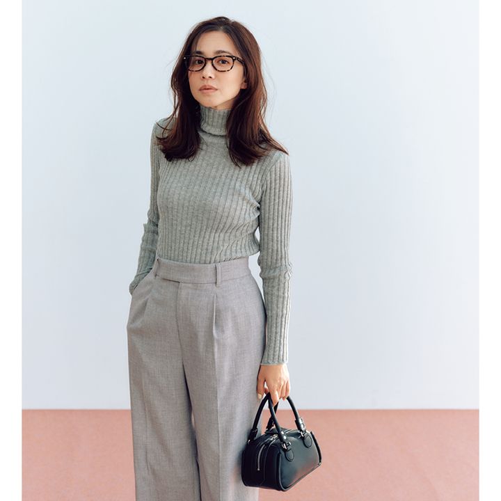 長めの袖が今っぽさを後押し。ネック部分はきちんと折らずにそのままクシュッとさせるのがこなれ見えのコツ。全体をワントーンでまとめても、太めのリブがアクセントになり、リズミカルな装いへと導いてくれます。