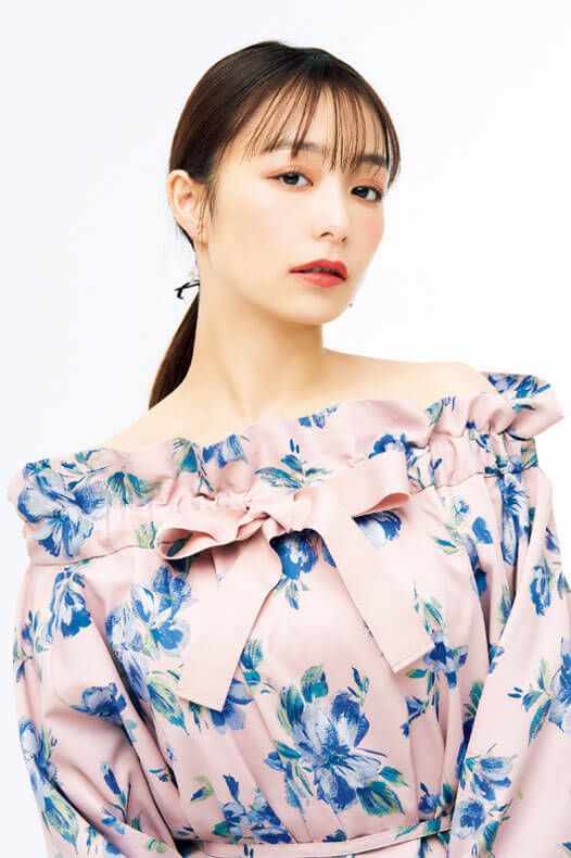 コントラストの強めな大花柄でも、顔のパーツに負けずに着こなせる。