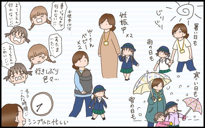決まった時間に家を出るだけって言えばそうだけど、そこまでにご飯食べさせて身支度して登園準備して行き渋りをなだめすかして…っていうタスクがあり、やっと家を出たと思ってもやれ歩けない、やれ転んだと立ち止まり、そうかと思えば突然走り出して道路に飛び出しそうになり…。