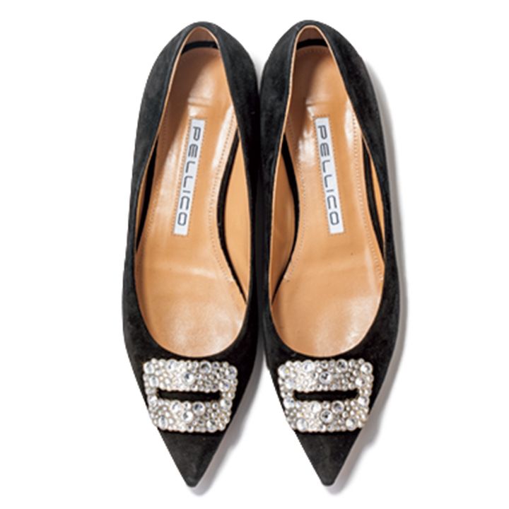 シンプルコーデに華やぎを添えてくれるビジュー付きデザイン。黒ならモノトーン服のカッコよさはそのままに、ちょうどいい女らしさが宿ります。¥89,100(ペリーコ/アマン)