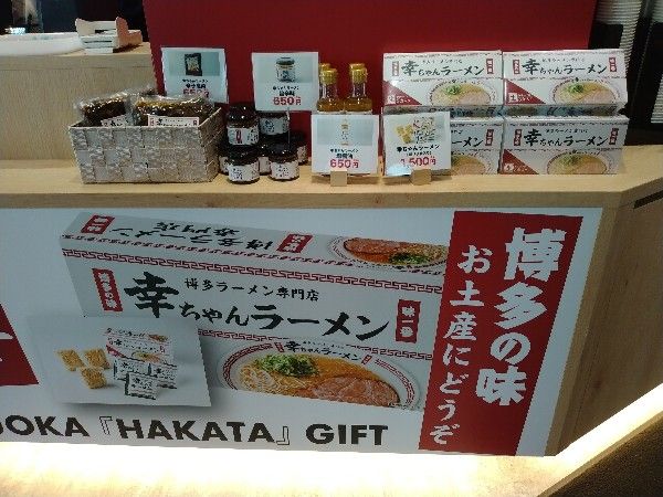 ラーメンや辛子高菜、塩醤油もお土産で購入できます。こちらで購入、新幹線で手軽におうちへ、誰かにお土産で持っていけるのがとっても便利。