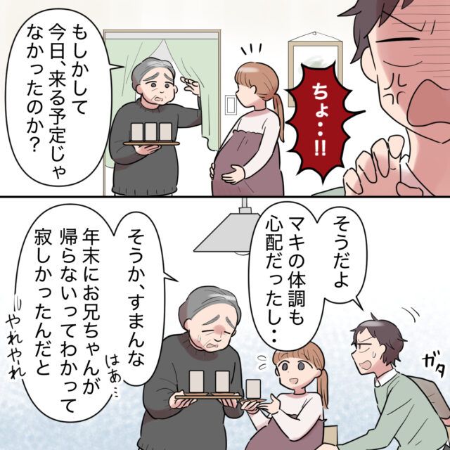 義母に年末里帰りする日を指定されたマキさん、予定日も近く、体調に不安を抱えながらもなんとか義実家を訪れたところ、集まっているはずのゆうさんのお兄さん家族の姿は見えず・・。義母にたずねると「あぁ、来るのは年明けよ?」とシレっと言われて・・