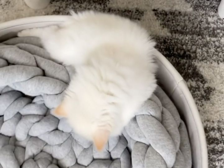 3. フカフカベッドまであと一歩なのに! おしい所で寝ちゃう子猫。