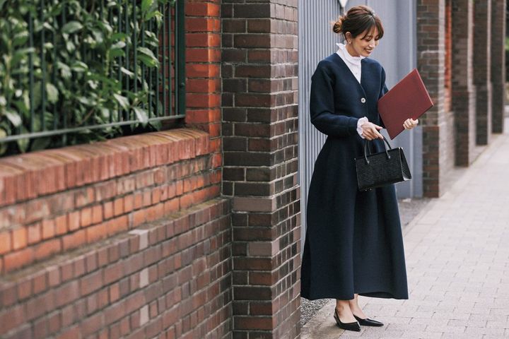 ロングコートを羽織ることで、上品な印象が強まります。首元から白い丸襟をのぞかせれば抜け感も出るので、肌寒い日ならコートを脱がないという選択もアリ。スカートはエステータ、アウターはランバン オン ブルー、ブラウスはマディソンブルー、バッグはカフネ、パンプスはピッピシック。