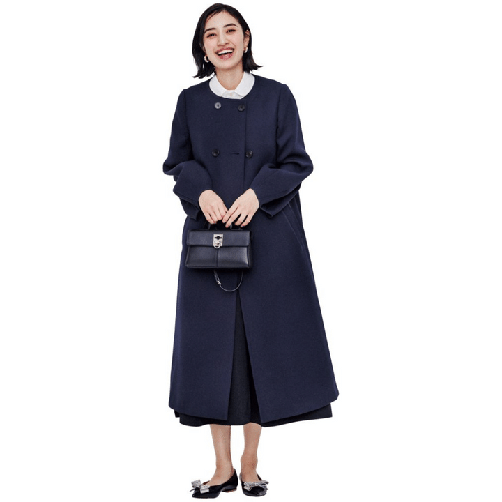 ×ノーカラーのロングコートなら 脱がなくてもサマになる