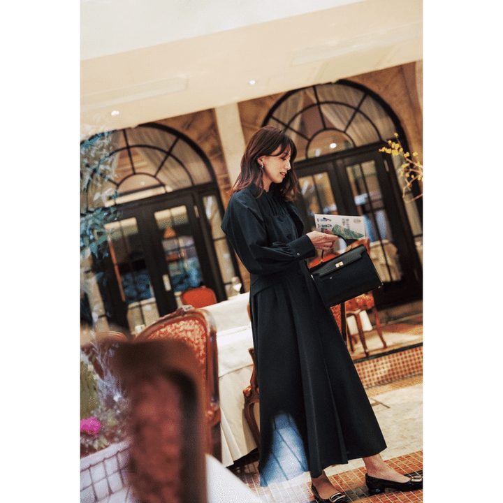一枚ワンピースに見えますが、実はブラウスとベアワンピを組み合わせた重ね着コーデ。シックなネイビースタイルも、凝った合わせをすることで一歩先行く着こなしに。ベアワンピースはエブール、ブラウスはル フィル、バッグはアニヤ・ハインドマーチ、パンプスはロジェ ヴィヴィエ。