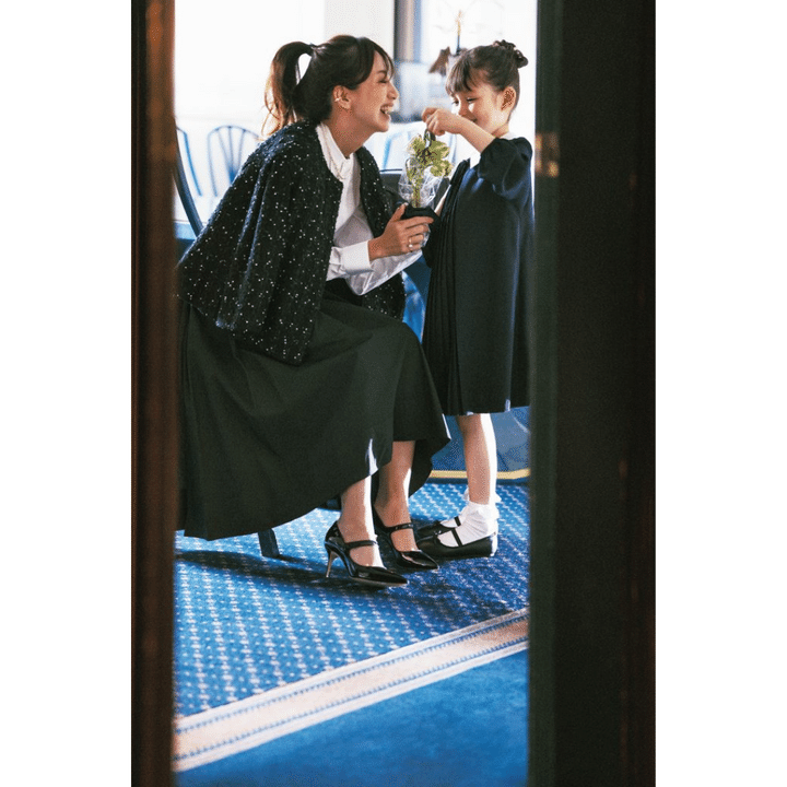 せっかくの式ならツイードジャケットにヒールのメリージェーンとフレアスカートで、王道のスタイルにするのも素敵です。スカートはマディソンブルー、ジャケットはデパリエ、ブラウスはセブリーヌ、パンプスはマノロ ブラニクのもの。