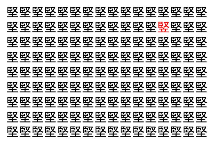 画像に並んだたくさんの「堅」という漢字。 その数144個なのですが・・・、実はその中に1つ違う漢字が紛れ込んでいます!!