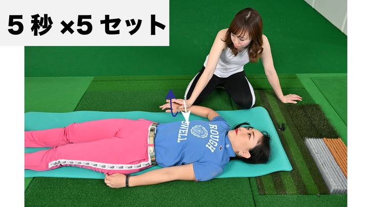 あおむけに寝た状態で肘を直角に曲げ、手のひら側を地面につけます。石堂さんが上から抑える手を押し返すように5秒間力を入れて肘から下を浮かせます。