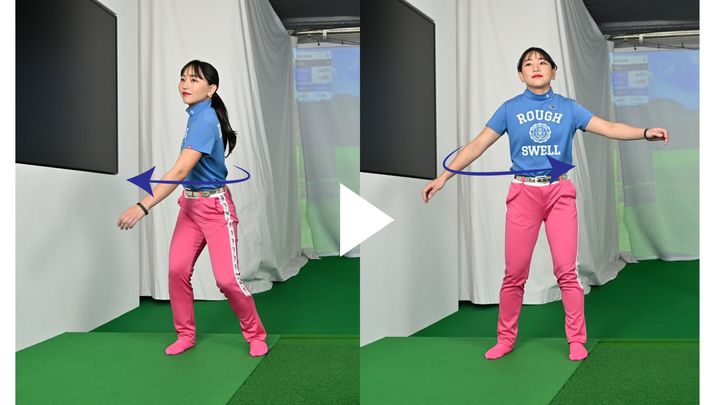 このとき、腕を振ることに意識を向けず、あくまで“体を動かしたら腕がついてきた”という状態にしておくのがベストです。意識を向けたところほど筋肉が強張りやすいので、緩めるためにも腕には意識を集中させないこと。目を瞑って行うのも効果的です。
