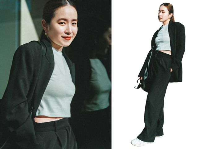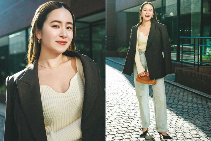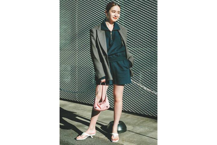 思い返せば、10代の頃から肌見せ服が大好きで、中高生時代はギャル雑誌のモデルに憧れ、ヘソ出しやミニスカコーデを真似していたことも。30歳になった今は、若すぎるイメージにならないよう、大人ならではのこなれ感や品を意識するようにしています。そんな時に頼れるのが「ジャケット」!唯一無二の端正さで、肌見せのセクシーさを和らげ、ハンサムさを添えてくれるんです。最近は、ショルダーパッド入りのメンズライクなデザインが気分。特にミニボトムスをはく時は、上半身のボリュームを重視しているので、かなり重宝しています。
