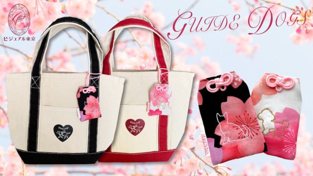 お出かけにぴったりなトートバッグと、桜柄のお守り袋のセット。「WE LOVE GUIDE DOGSトートバッグ」は、赤と黒の2色展開。「ワンニャン桜お守り」は、30種類以上のワンちゃん&ネコちゃんから好きな絵柄を選択できます。