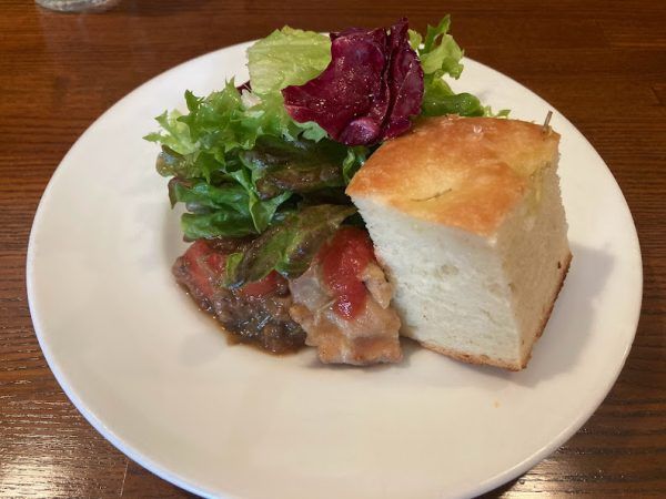 最初に出てきたのは”自家製フォカッチャとミニサラダ、ひとくち前菜の盛り合わせ”。