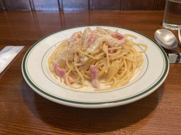 美味しく前菜をいただいていると、ほどなくやってきたのがメインの”ベーコンと大根のクリームスパゲティ”。