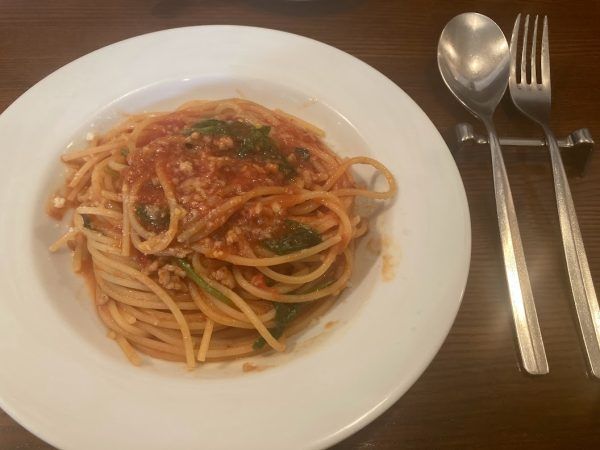 こちらは”豚挽肉とルコラのトマトスパゲティ”。どちらもパスタの茹で方が絶品!!スパゲティは芯があってかみごたえがある、でも硬すぎず最高の硬さです。