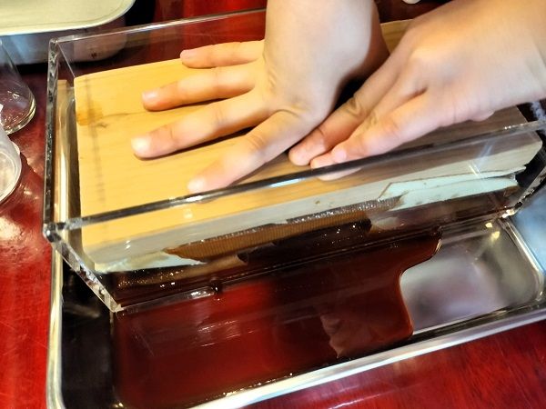 重ねていく過程でもう醤油が出てきました!おお~すごーい!と感動しちゃいます。そして上から押して更に絞り出します。