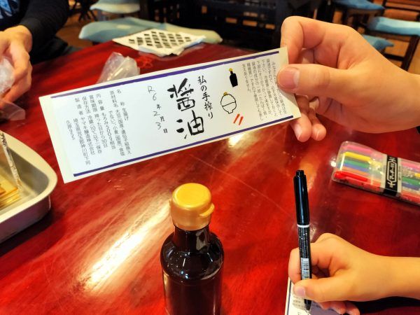 そしてイラストなどを書いた自分だけのオリジナルのラベルを貼ったら「私の手作り醤油」の完成です!息子は卵かけご飯のイラスト。