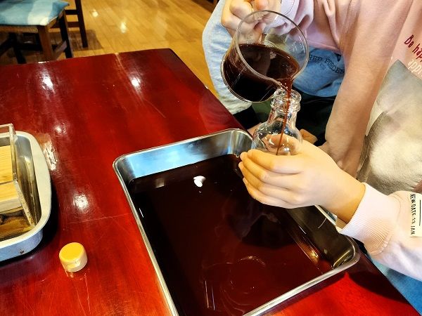 絞った醤油を瓶に入れて、栓をする作業も自分で行います。ポコンと栓がされて面白かったです。
