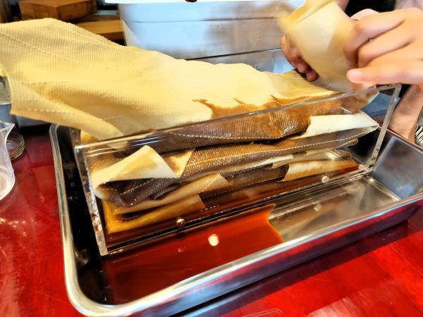 そのもろみを濾布(ろふ)に注ぎ、折りたたみます。それをミルフィーユ状に繰り返していきます。