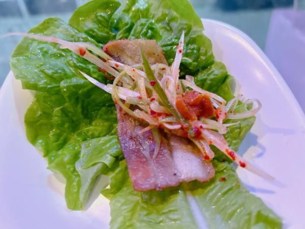 お肉が焼けたら、ごま油に漬けてネギと辛味噌と一緒にサンチュで巻いていただきま~す。