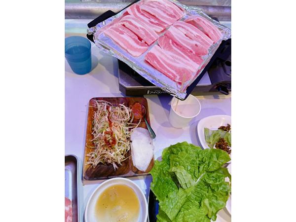 サムギョプサル!鉄板の右角に穴が空いています。鉄板が少し斜めになっていて、竹串を伝って脂が紙コップに落ちる仕組み!!!画期的!