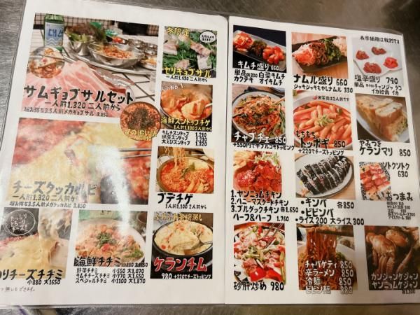 美味しそうなお料理。 私たちはこの中からサムギョプサル、海鮮チヂミ、ヤンニョムチキン、キンパ、ナムル等を注文。