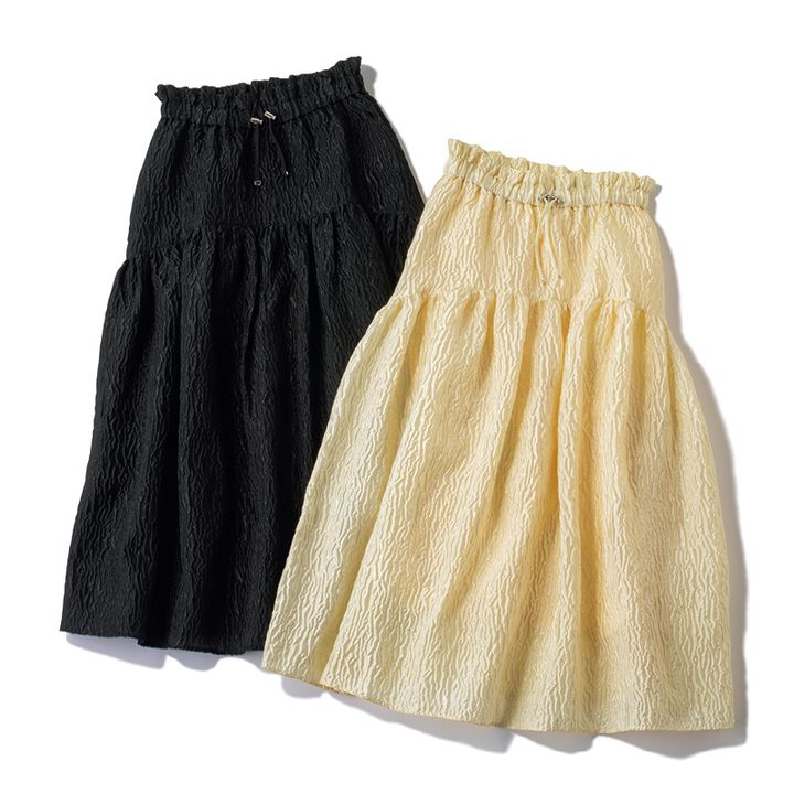 ハリのあるポコポコとしたジャカード素材を使用したスカート。ドローコードでウエスト調整可能。両ポケット、裏地付き。手洗い可。