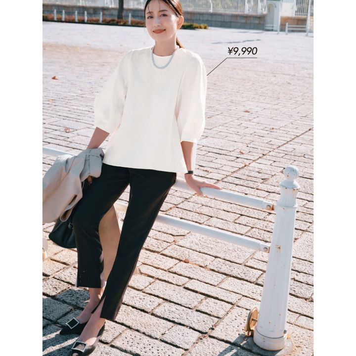 黒パンツのワンツーコーデも 高級感のある白トップスで きちんとシーンに対応