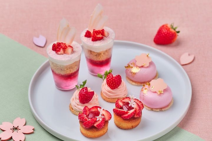 桜の季節はイチゴの旬の時期とも重なり、かわいらしいピンクがポイントのスイーツを堪能できます。三段スタンドの上段は「桜香るヴェリーヌ」「桜といちごのモンブラン」「いちごのミニタルト」「いちごとベルガモットのムース」といちご尽くしのラインアップ。