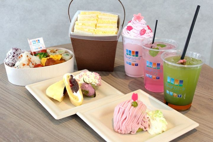 てんぼうパークには飲食可能なエリアもあるため、外でのお花見と同じようにおいしいお弁当などを食べながら過ごすことができます。「てんぼうパークCAFE」には期間限定のお花見メニューが登場し、ホイップクリームに花びらチョコが乗った「さくらいちごミルク」(550円)、数量限定の「さくらモンブラン」(600円)、「てんぼうお花見弁当」(850円)などがラインアップしています。
