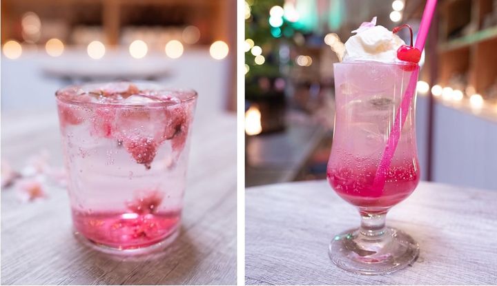 写真左:お花見BARメニュー「桜サイダー」(440円)/写真右:桜クリームソーダ(638円)(画像:株式会社温泉道場リリース)