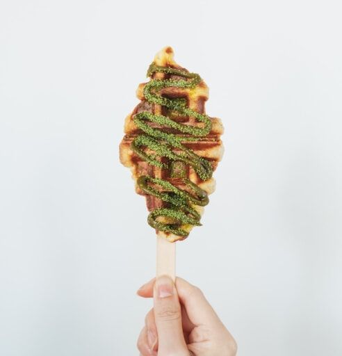 焼き立てで提供される「クロッフル」は、ワッフルメーカーで焼き上げたクロワッサン。フワフワの食感で、抹茶ミルクジャムがたっぷりかかっています。