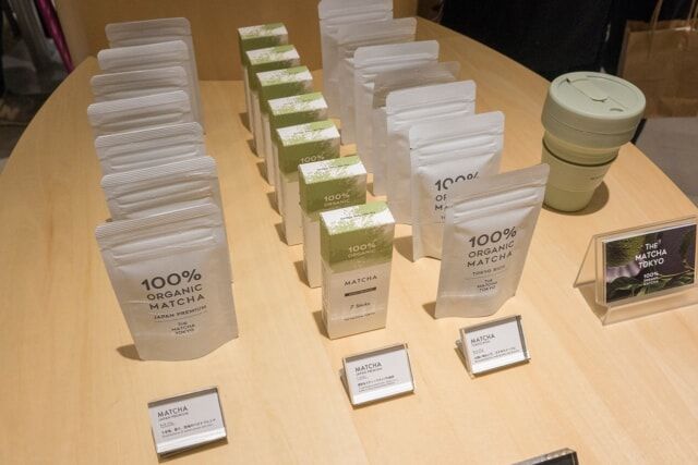 お茶にかかわる商品も販売。オーガニック栽培や味、ブレンドにこだわった、抹茶や茶葉、抹茶のスイーツ、抹茶を点てるための茶器などをそろえます。