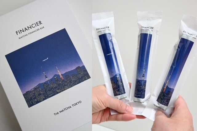 新商品の「抹茶フィナンシェ」は、抹茶と米粉を使って焼き上げたスイーツで、イラストレーターの永井博氏が描き下ろした限定パッケージを採用。スカイツリー、東京タワー、飛行機など、東京の街並みを思わせるイラストです。もちろんお土産にも最適です。