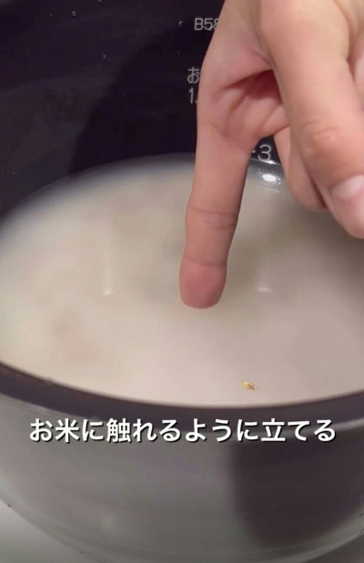 次に、お米に触れるところまで指を立てるようにして入れます。