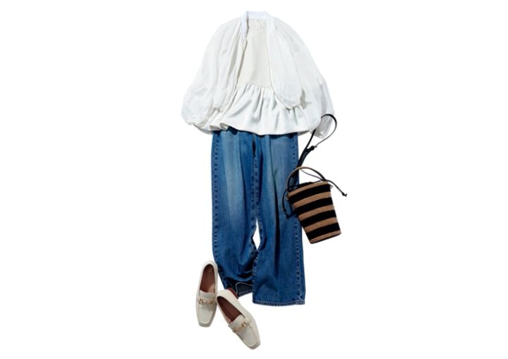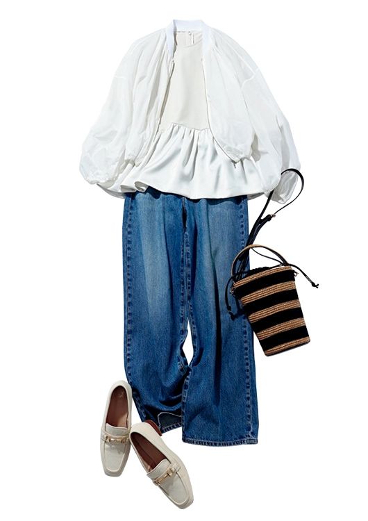 セットアップ(ブラウス)¥19,910/ミラ オーウェン ルミネ新宿2店、シアーブルゾン¥17,930/アンクレイヴ スタンダード(オンワード樫山)、デニムパンツ¥3,990/UNIQLO、バケツバッグ¥6,930/カシュカシュ(アンビリオン)、ローファー¥17,600/Stola.