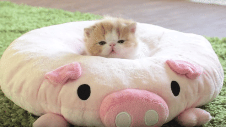 2. 最高に可愛い! 子ブタのクッションに座る3匹の子ネコ。
