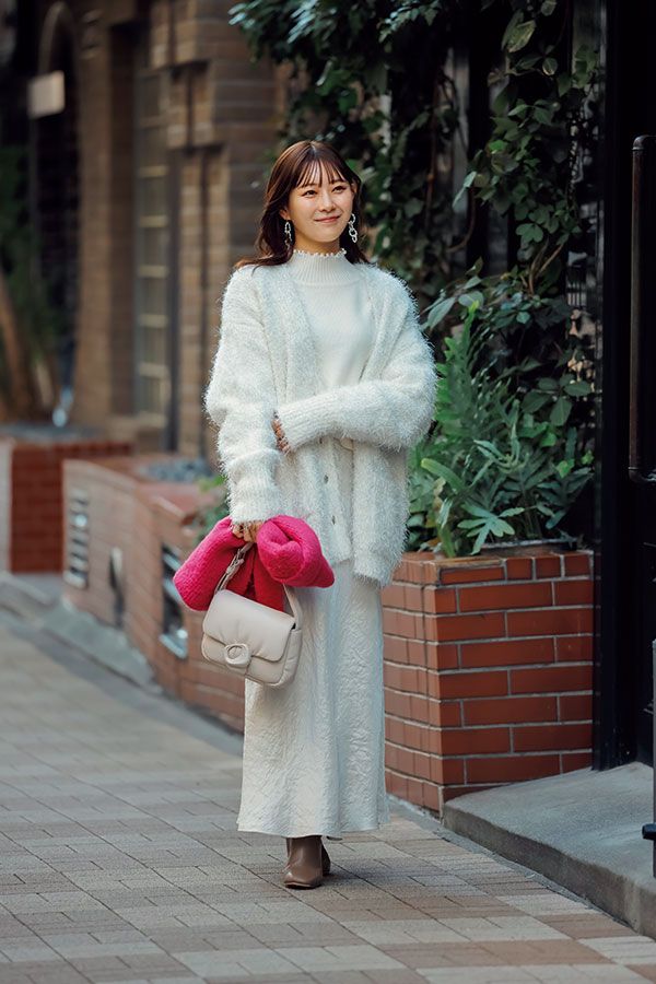まだ寒さの残る週末は、もこもこのシャギーカーデで暖かく。ブーツで足元を防寒しても重く見えないよう白のワントーンでまとめて。美人百花2月号から3月23日(土)のおすすめコーデをご紹介します。